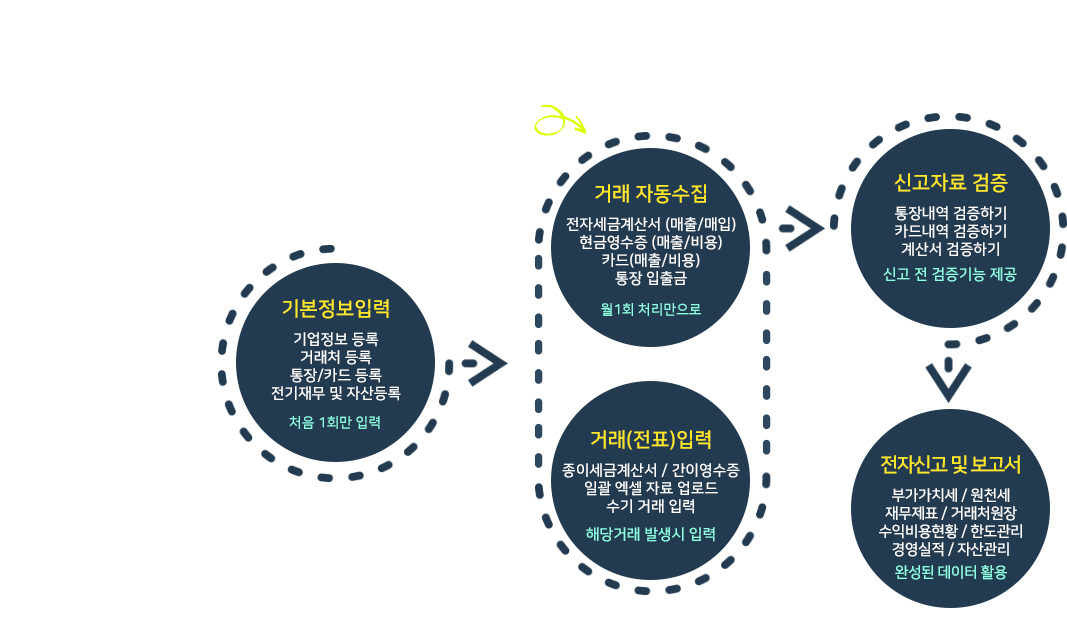 현금영수증의 매출/매입, 카드의 매출/사용내역, 은행의 입출금내역 등 모든 거래가 자동으로 입력됩니다.